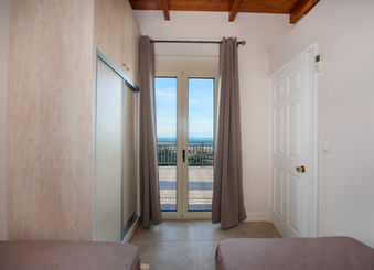 A bedroom with two single beds, wardrobe, 32'' smart TV, air conditioning and access to a terrace with a view of the endless blue.