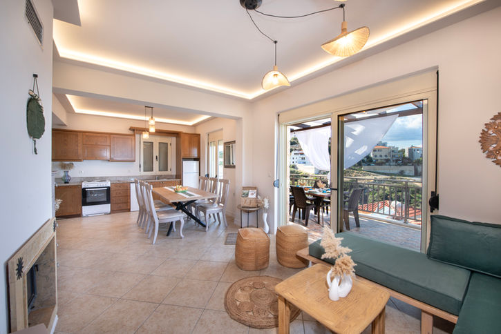 Στον πρώτο όροφο συναντάτε έναν φωτεινό ενιαίο χώρο με καθιστικό, κλιματισμό, smart TV, τραπεζαρία και πλήρως εξοπλισμένη κουζίνα. Στο επίπεδο αυτό υπάρχει μπάνιο καθώς και πρόσβαση σε μεγάλη βεράντα με καθιστικό, από όπου μπορείτε να απολαύσετε θέα στη θάλασσα και το βουνό.